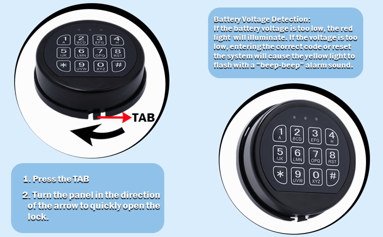 Easy Operation & Installation: Open with 3-8 digital codes that can be programmed and 3 different colors of lights indicating different states. To replace the battery, remove the keypad face by pressing the tab